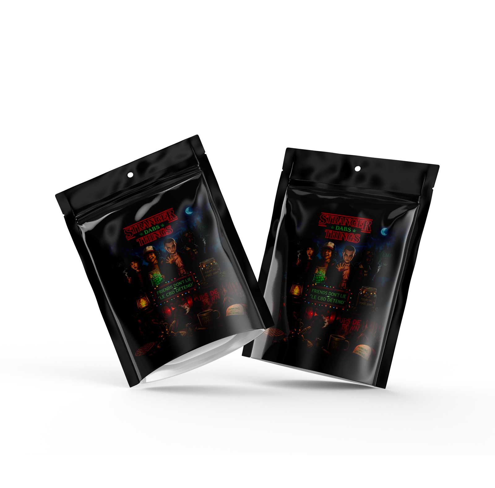 Avec le Pochon Stranger things weed cbd, on est tout de suite sur un modèle qui attire l’œil. Son visuel s’inspire d’un univers culte, mystérieux et reconnaissable au premier regard, revisité dans une version plus décalée et plus marquante. Ce n’est pas un simple pochon plastique pensé uniquement pour ranger. C’est aussi un packaging qui apporte une vraie identité visuelle, une ambiance forte et une présence immédiate à ce qu’il contient.